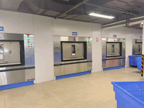 海獅目前為華西天府醫(yī)院配置了洗衣龍、衛(wèi)生隔離式洗滌脫水機、全自動烘干機、四工位展布機、自動熨平機&高速雙面燙平機、四輥熨平機、全自動高速折疊機、堆碼機、烘干龍、純蒸汽發(fā)生器、脈動真空滅菌器、純水制備系統(tǒng)等全套洗消設(shè)備。并確保所有設(shè)備嚴格按照 WST367-2012《醫(yī)療機構(gòu)消毒技術(shù)規(guī)范》、WS/T508《醫(yī)院醫(yī)用織物洗滌消毒技術(shù)規(guī)范》等標準規(guī)范的要求,設(shè)立“兩區(qū)三通道”(即潔凈區(qū)、臟污區(qū)、工作人員通道、醫(yī)用織物接收專用通道、醫(yī)用織物發(fā)放專用通道),做到工作流程由污到潔,不交叉、不逆行。并在潔凈區(qū)和污染區(qū)之間設(shè)置完全隔離屏障,實施負空氣壓阻斷,使?jié)嵨蹆蓞^(qū)之間實現(xiàn)雙通道的全封閉式實質(zhì)性隔斷,空氣不對流。