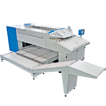 機(jī)器有精確的感應(yīng)器能自動識別毛巾大小,并自動調(diào)整合適的折疊寬度,通過橫折板進(jìn)行橫折折疊。